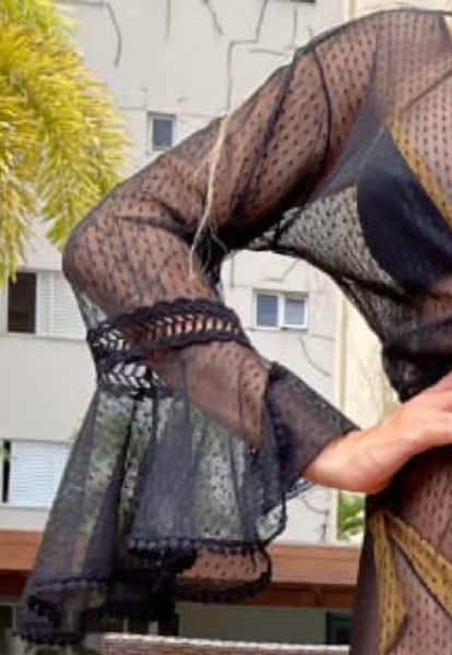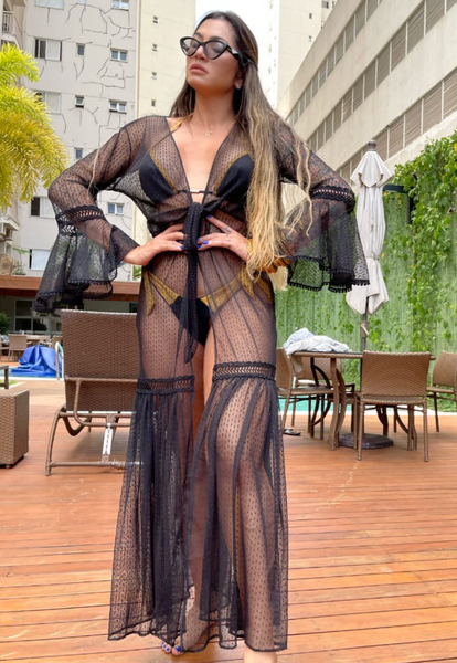 Chame a atenção em todos os lugares com nosso vestido maxi preto de renda com um tecido de renda transparente e detalhes em guipura.