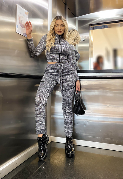 DESCRIPTION: JACQUARD SET WITH ELASTANE (3%) LINED, CROPPED HIGH COLLAR WITH BULGE AND ZIPPER ON THE FRONT. JOGGER PANTS WAIST AND CUFFS WITH ELASTIC, KNIFE POCKET ON THE FRONT AND POCKET ON THE BACK, CUTOUT AND ZIPPER NEAR THE KNEE.