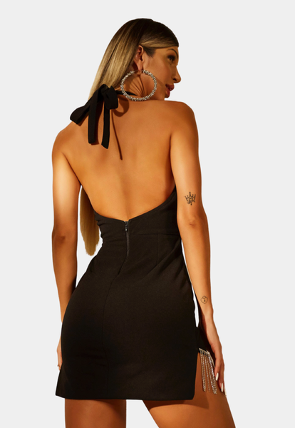 Chame a atenção com nosso vestido preto de strass com decote em V profundo e um lindo detalhe de cristal prateado.